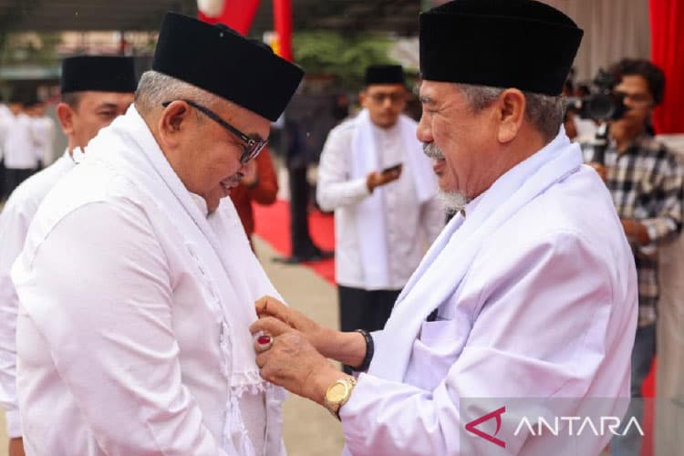 TIMES Bogor/Pimpinan pesantren Insafuddin Banda Aceh memberikan kain kepada Sekda Aceh Bustami Hamzah usai peringati Hari Santri, di Banda Aceh, Selasa (24/10/2023). (FOTO: ANTARA/HO/Humas Pemprov Aceh)