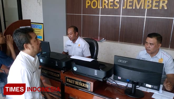 TIMES Bogor/Wakil Ketua Bidang Litbang dan IT DPD Partai Perindo Kebupaten Jember, Ahmad One Prastiono saat melaporkan Ketua DPD Partai Perindo Kabupaten Jember Hanung Prijobodo ke Polres Jember, Senin (6/5/2019). (FOTO: Dody Bayu/TIMES Indonesia)